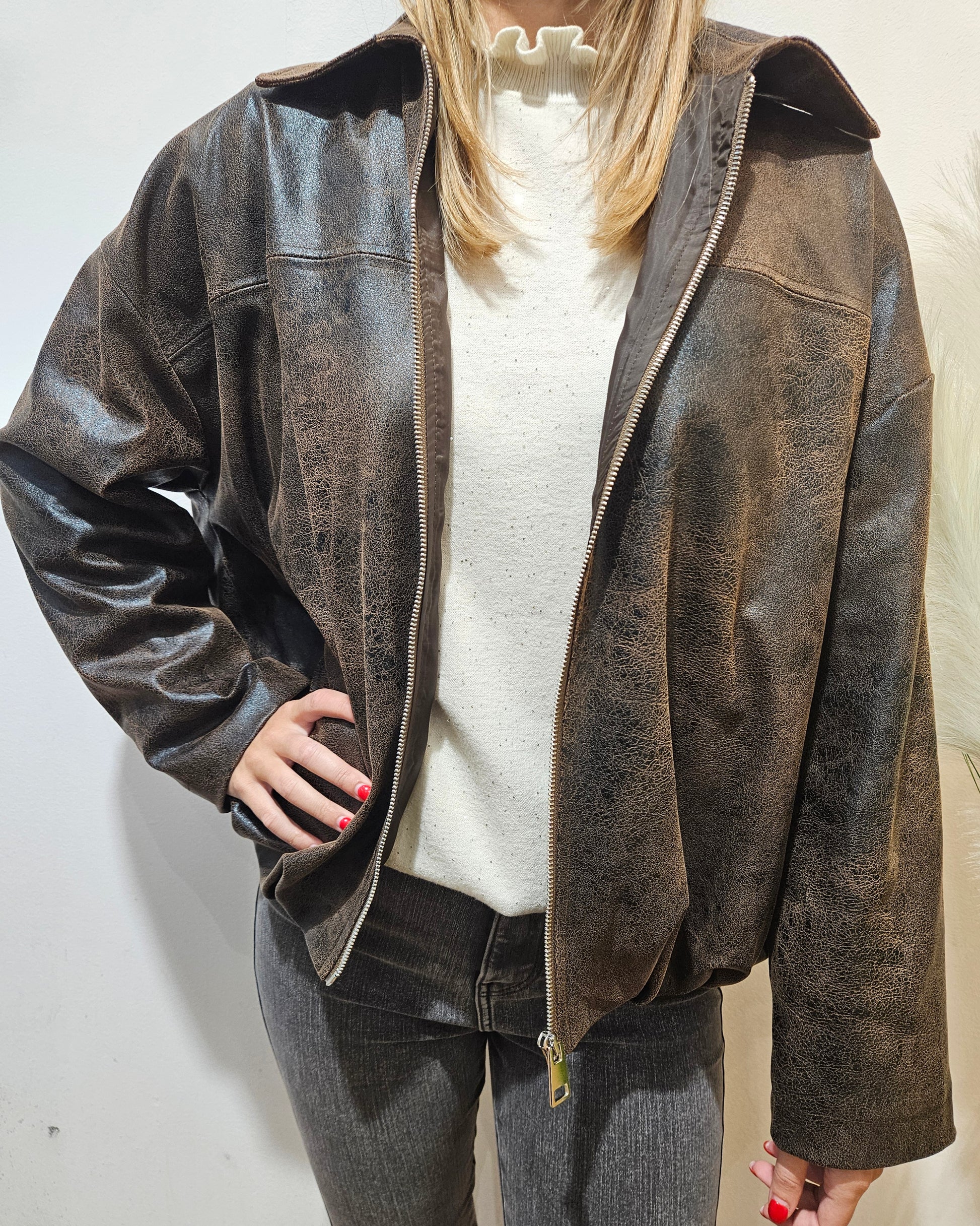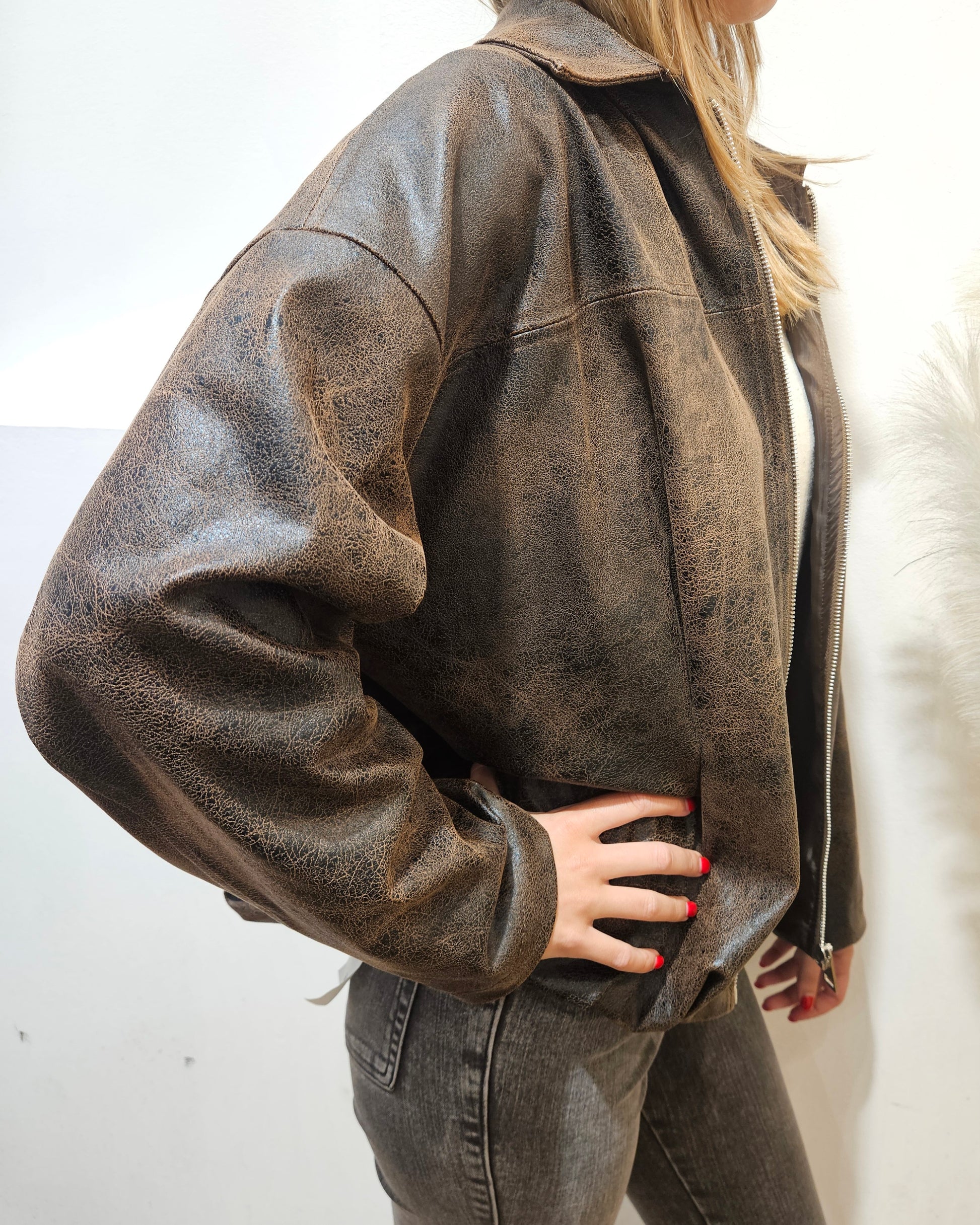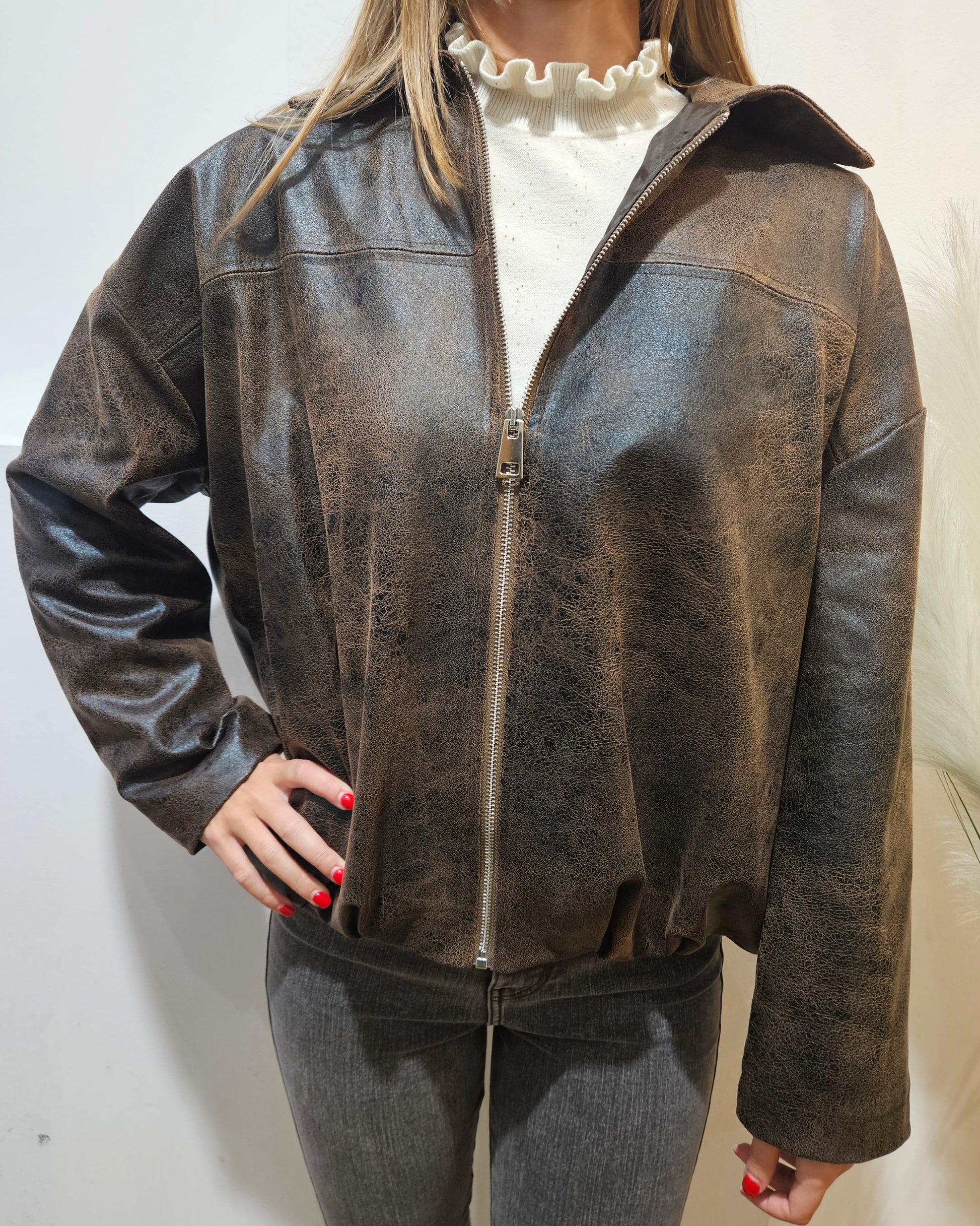 Bomber Have One nella tonalità moro, effetto invecchiato, zip frontale, fit morbido.