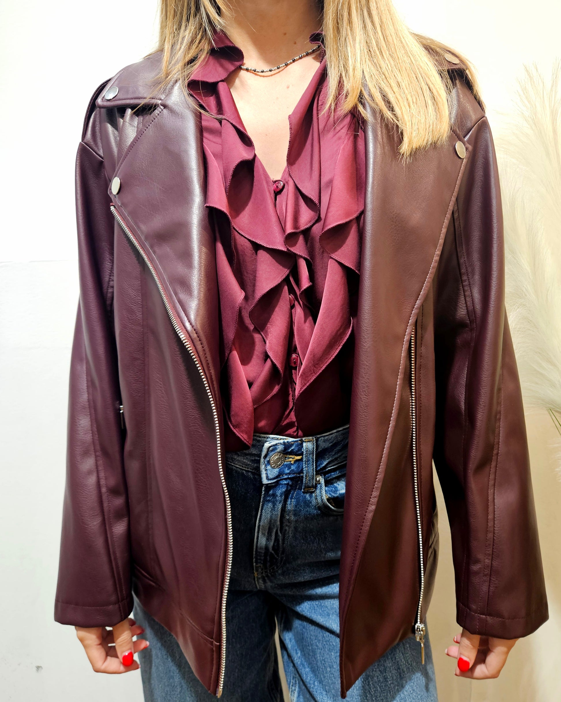 Chiodo over in ecopelle Have One nella tonalità bordeaux, chiusura frontale con zip, collo a revers.