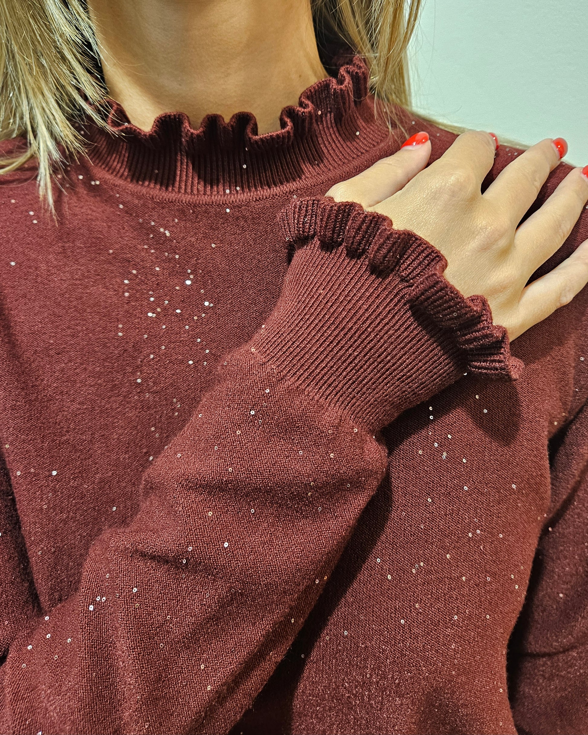 Maglia Have One con rouches nella tonalità bordeaux con micro paillettes.