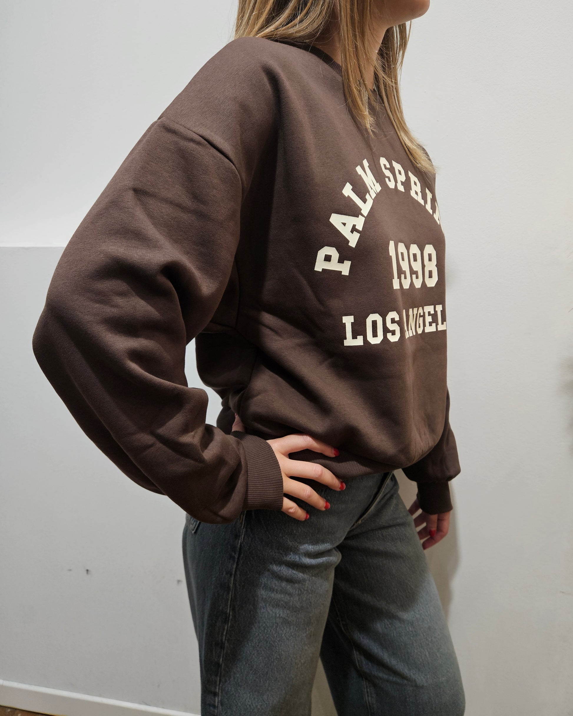 Felpa JJXX nella tonalità moro con stampa frontale, fit morbido.