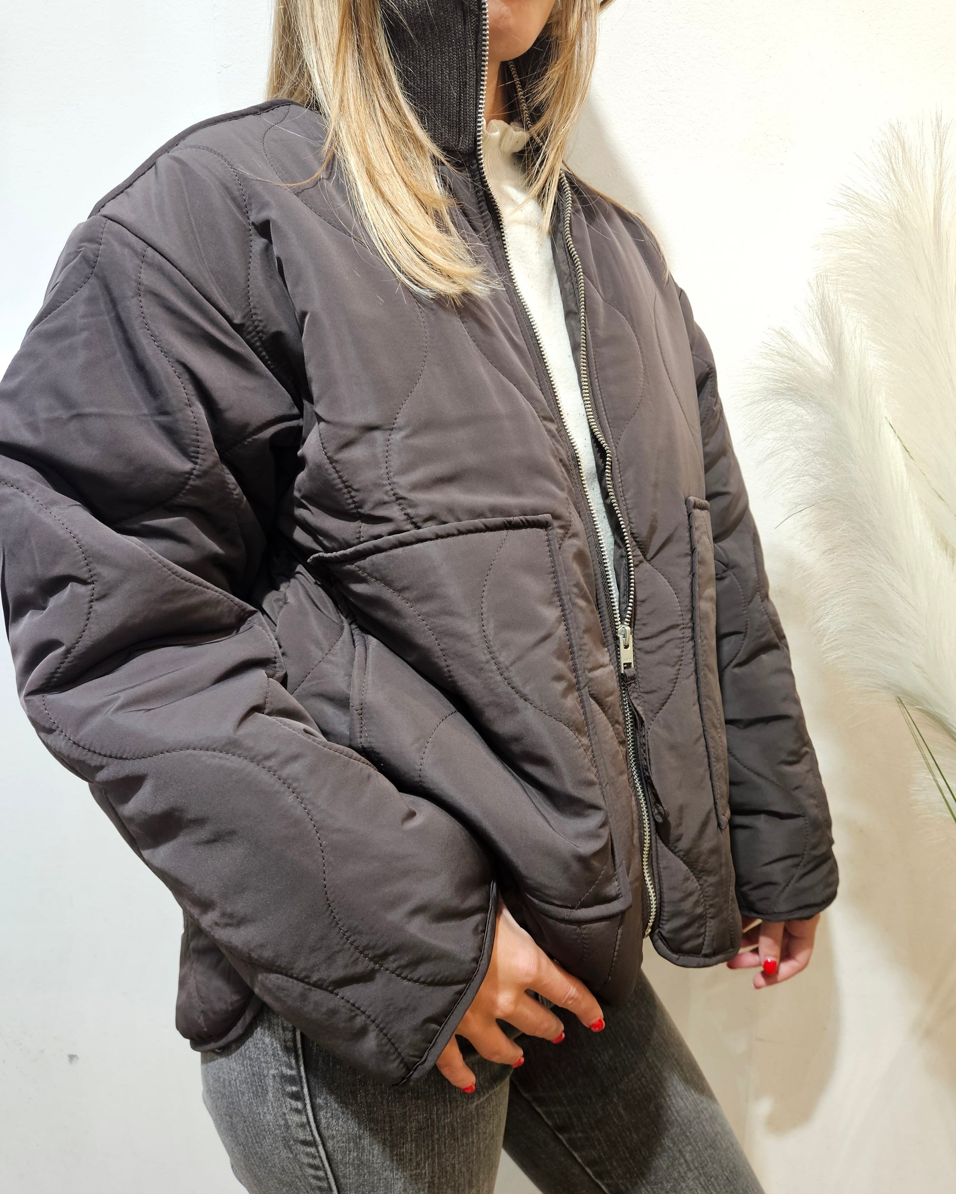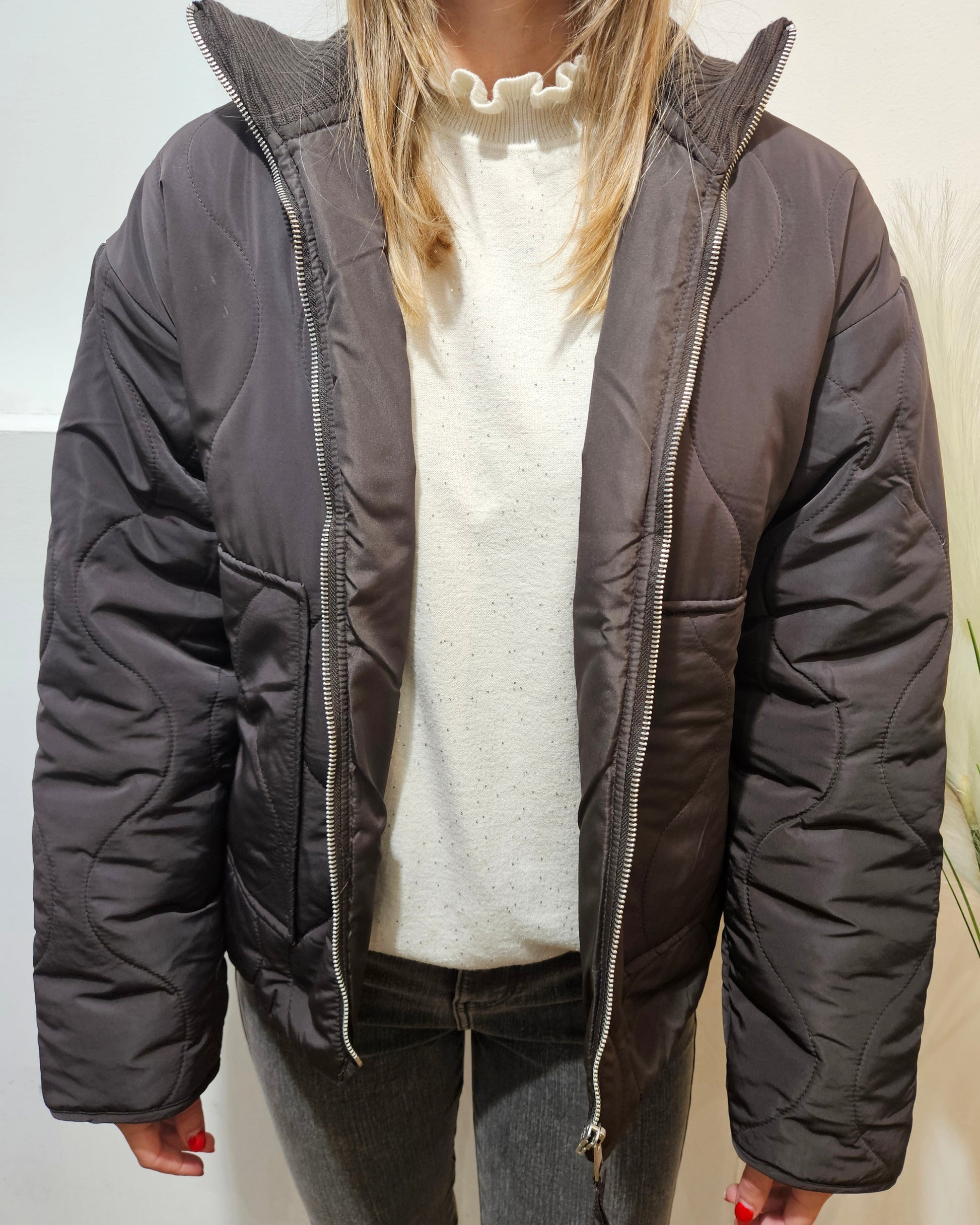Giubbotto trapuntato JJXX nella tonalità moro, colletto alla coreana alto, chiusura con zip e tasche laterali.