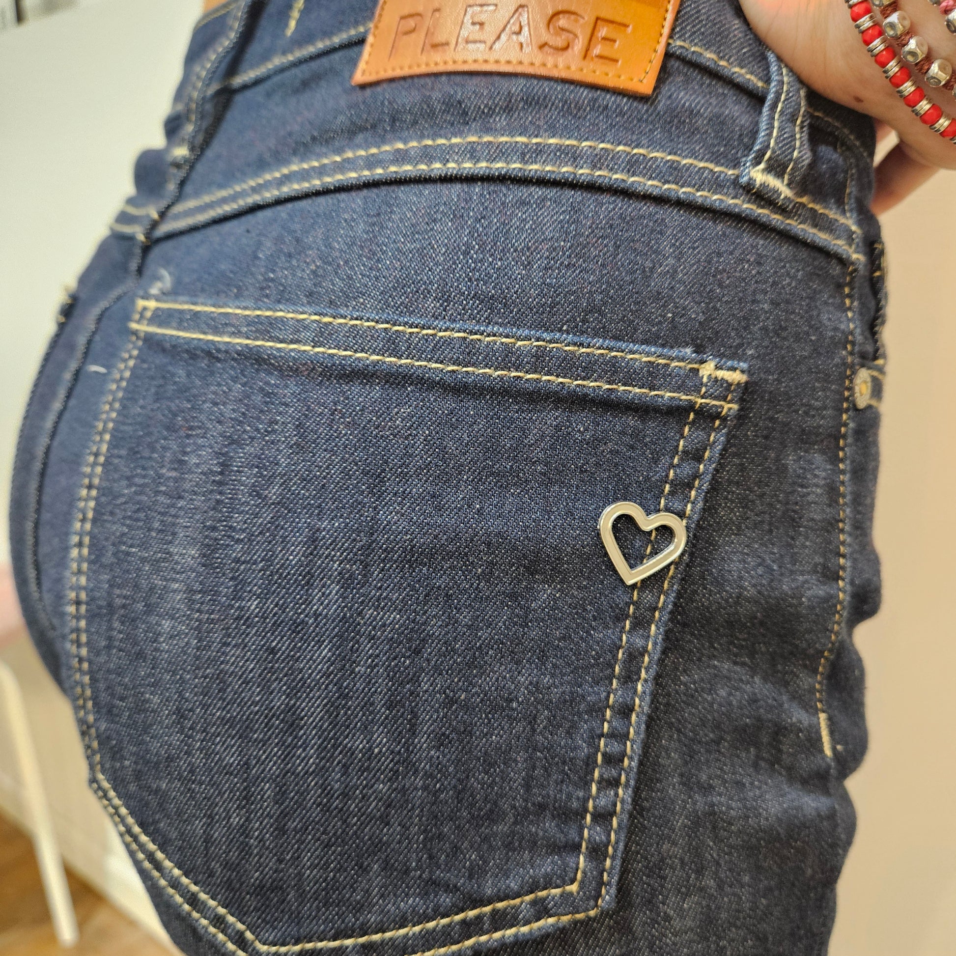 Lavaggio scuro, ottima vestibilità, cuore dettaglio applicato sulla tasca posteriore.