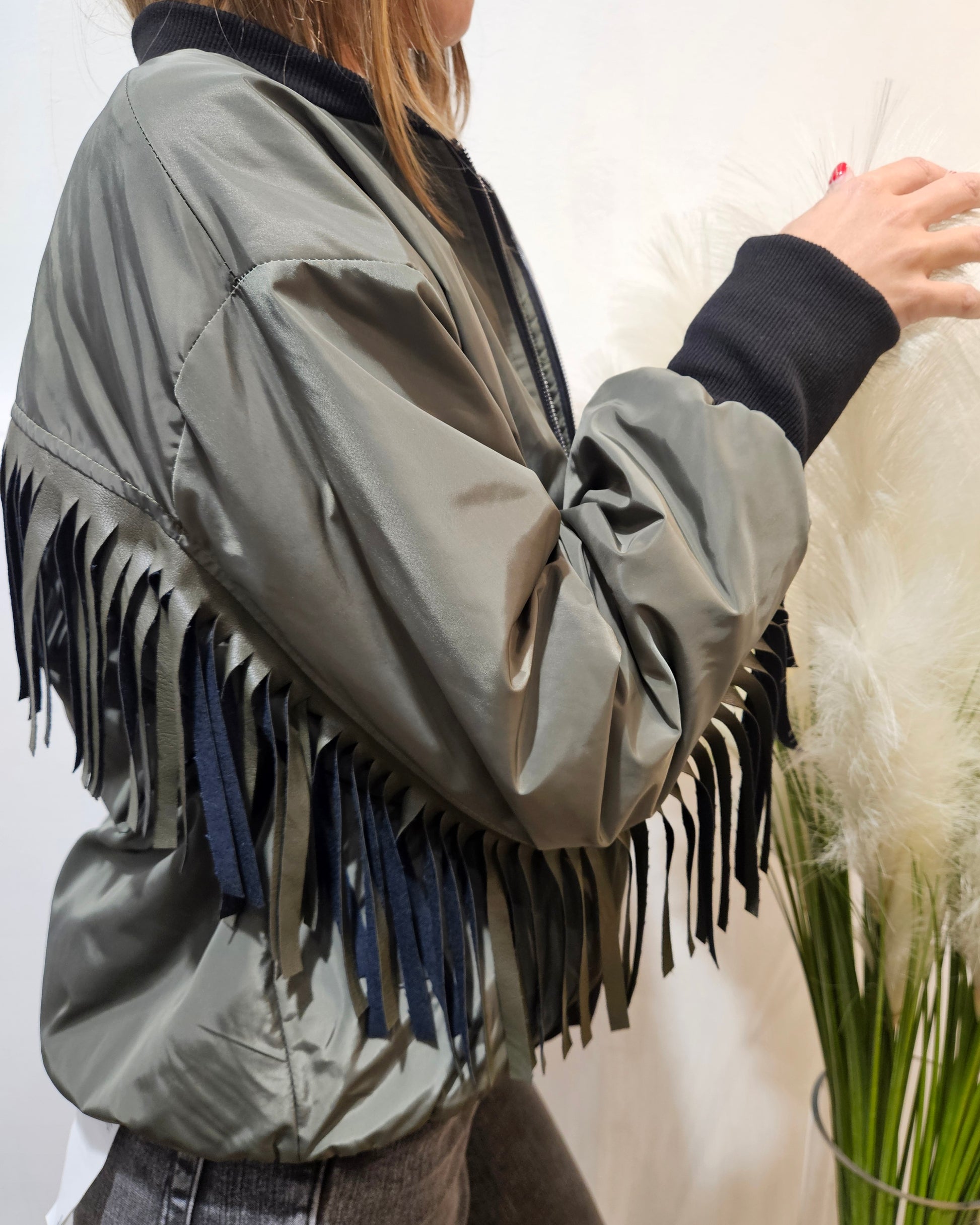 Bomber Susy Mix nella tonalità verde militare con frange su maniche e schiena.