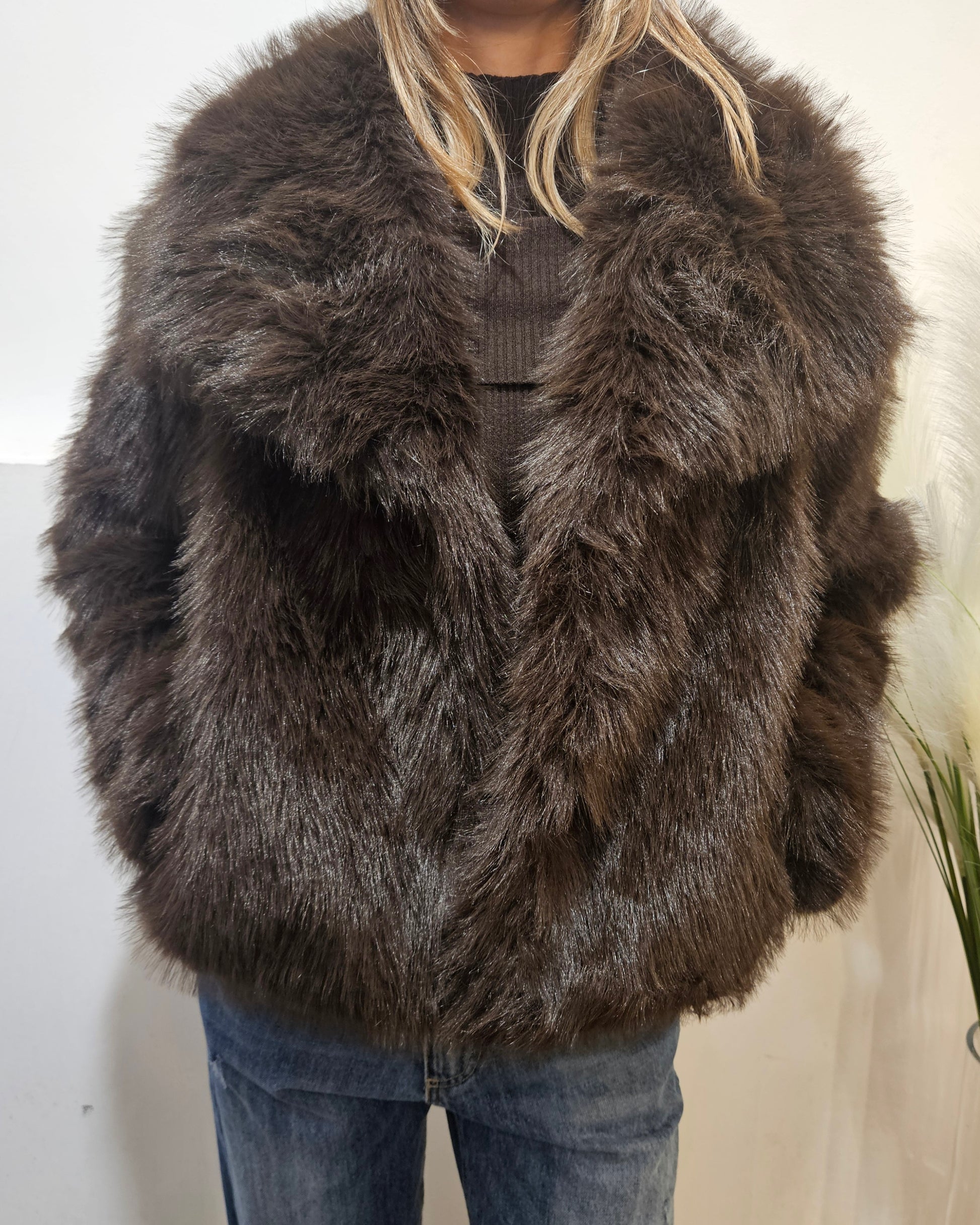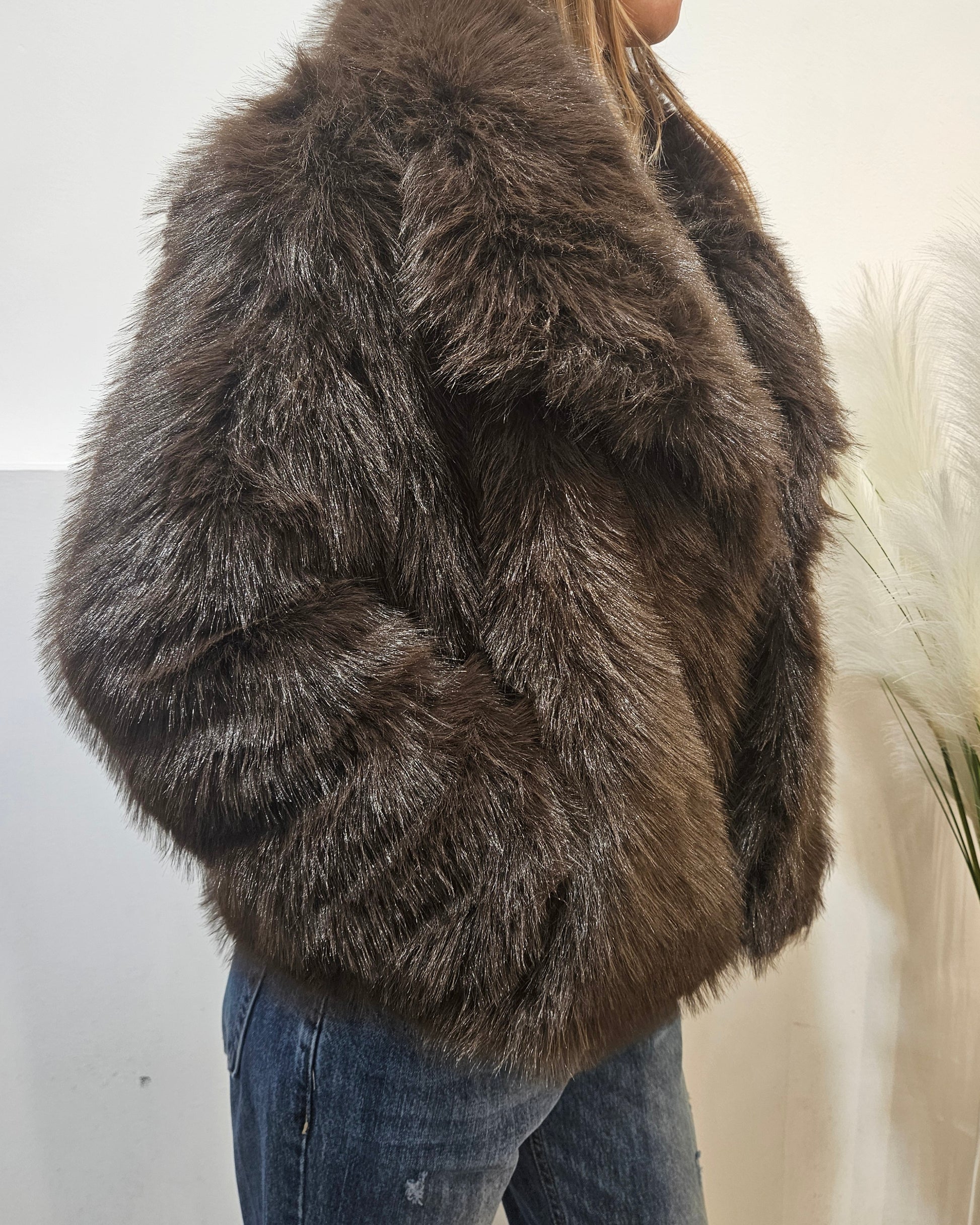 Ecopelliccia Susy Mix nella tonalità moro con chiusura con bottone a clip e tasche laterali.