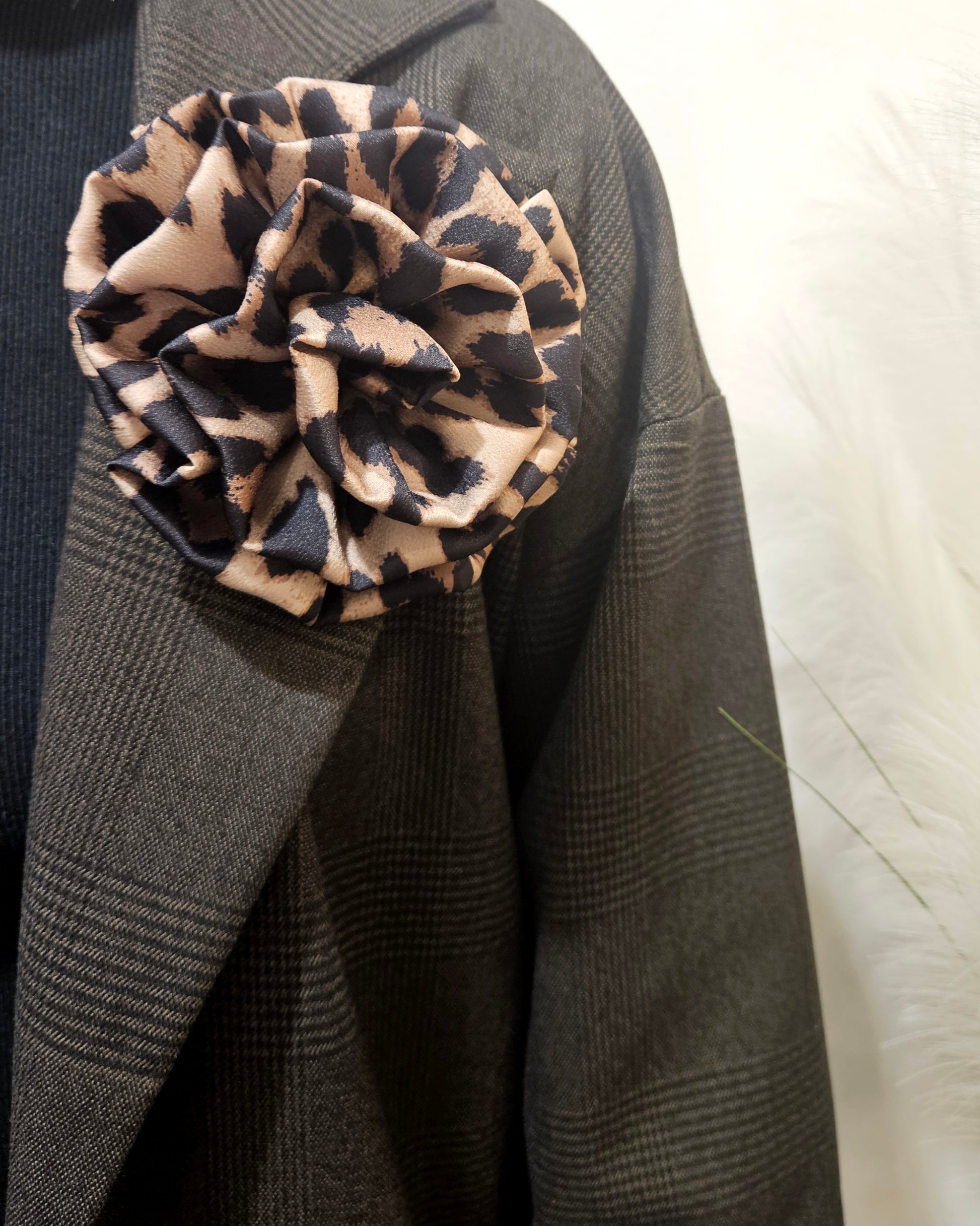 Giacca Susy Mix nella tonalità moro con spilla fiore animalier, tasche laterali, fodera interna animalier.