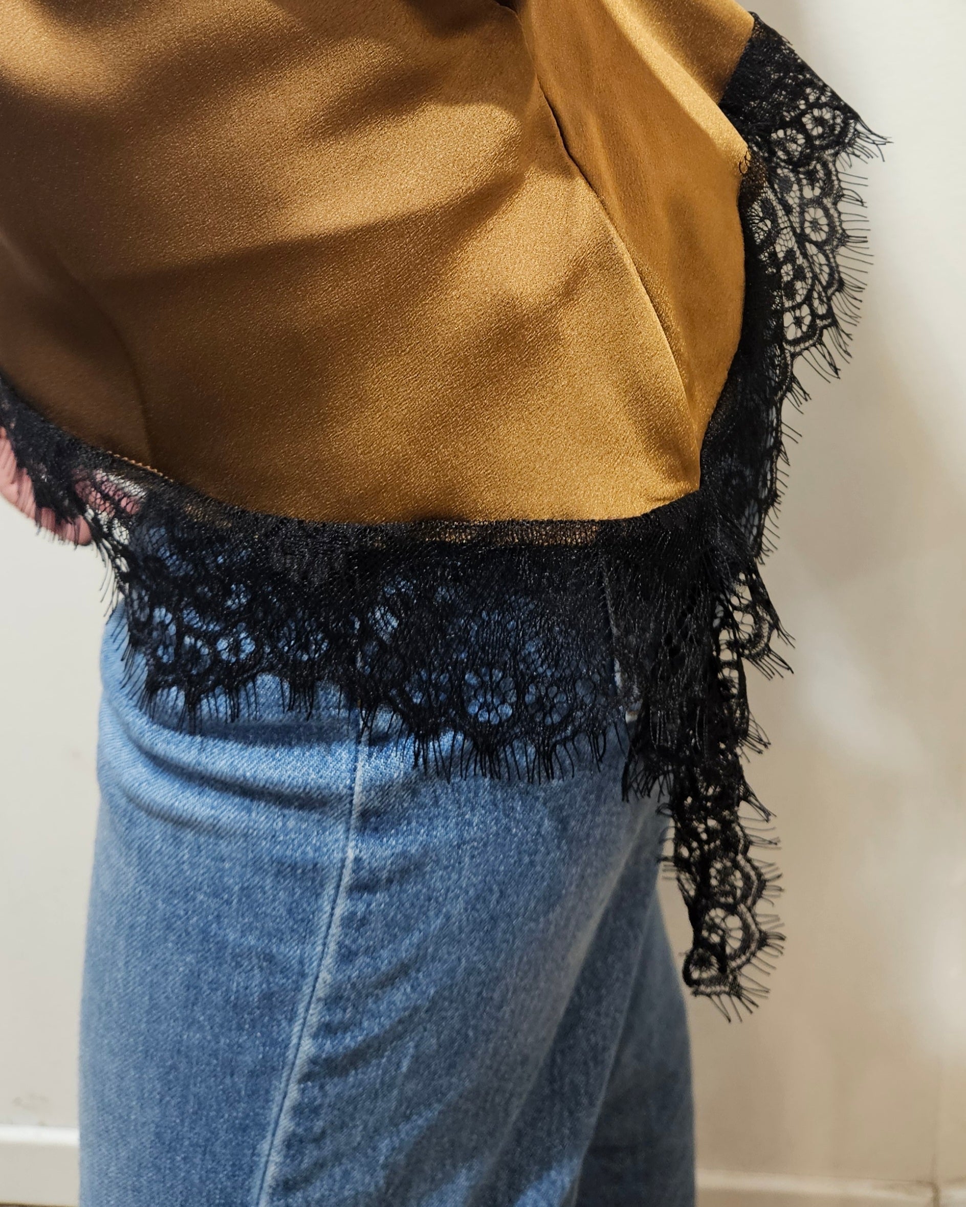Top satinato in pizzo Susy Mix con scollo a V e spalline sottile nella tonalità tabacco con margine asimmetrico.